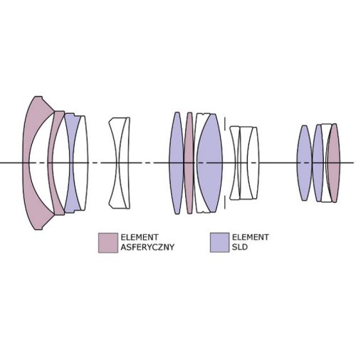 Obiektyw ma bardzo skomplikowaną konstrukcję optyczną, zastosowano w nim aż 17 soczewek ułożonych w 12 grupach. 4 z nich to soczewki sferyczne, a kolejnych 5 to elementy ze szkła SLD, odpowiedzialnego za likwidację abberacji. Tak zaawansowana konstrukcja zapewnia rewelacyjną jakość obrazu nawet przy pracy pod słońce, ponieważ wszystkie soczewki pokryto licznymi warstwami antyrefleksyjnymi eliminując bliki i flary.